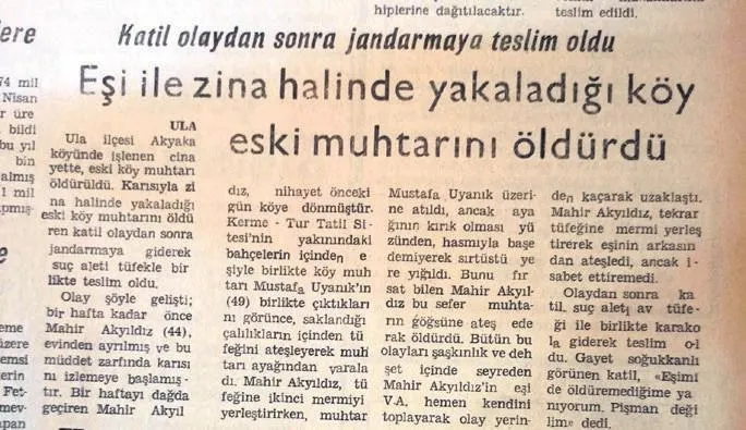 Muğla'nın Ula ilçesinde bir süre önce vefat eden Fatma A. geçmişte yasak aşk yaşadığı Akyaka'nın en zenginlerinden olan Mustafa Uyanık'tan 49 yıl önce bir kız çocuğu sahibi oldu. Fatma A. bu sırrı saklayarak Berrin N.'yi (49) resmi nikâhlı eşi Mahir A.'nın üzerine kaydettirdi. Mahir A. eşi ile yasak aşk yaşayan o dönemin Akyaka Mahalle Muhtarı Mustafa Uyanık'ı 1982 yılında eşiyle birlikte ormanlık alanda yakalayınca öldürdü.