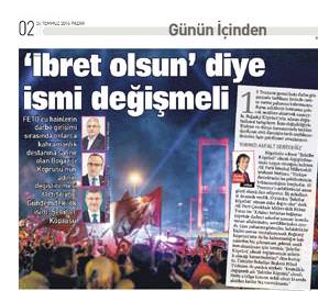 Boğaziçi Köprüsü'nün isminin değiştirilmesi önerisini SABAH gazetesi "İbret olsun diye ismi değişmeli" başlığı ile sayfalarına taşımıştı. Başbakan Binali Yıldırım, önceki gün köprünün adının "15 Temmuz Şehitler Köprüsü" olarak değiştirilmesine karar verildiğini açıklamıştı.