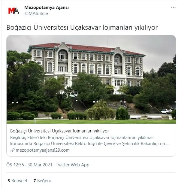 Boğaziçi Üniversitesi Rektörlüğü; "Rektörlük ve bakanlık mutabakata vardı; Boğaziçi Üniversitesi Uçaksavar lojmanları yıkılıyor" başlıklı haberlerin gerçeği yansıtmayan spekülatif haberler olduğunu açıkladı.