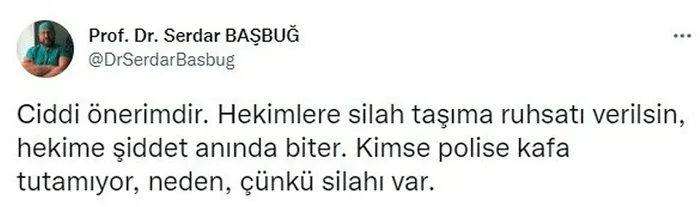 Sağlıkta şiddet olaylarıyla ilgili sosyal medya hesabından kullandığı "Ciddi önerimdir. Hekimlere silah taşıma ruhsatı verilsin, hekime şiddet anında biter. Kimse polise kafa tutamıyor, neden, çünkü silahı var" ifadelerine ilişkin de Başbuğ, "Sosyal medya paylaşımıyla ilgili insanları yargılamamak lazım. Bence sosyal medyada insanlar içinden geldiği gibi konuşabilmeli. Bu bir fikirdi. Fikir verilir. Karşıdan da fikirler gelir. O twitin bu olayla hiçbir alakası yok. Ben o twitte kimseyi şiddete özendirmiyorum." diye konuştu.