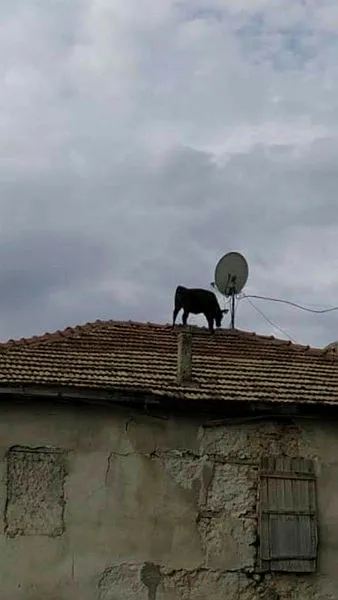 İlçeye bağlı Çamlık köyünde Mesut Uğraş'a ait olduğu öğrenilen dana ağırdan kaçtı. Ahırın yere yakın bölgesinden çatıya çıkan dana, oradan da başka bir evin çatısına atladı.