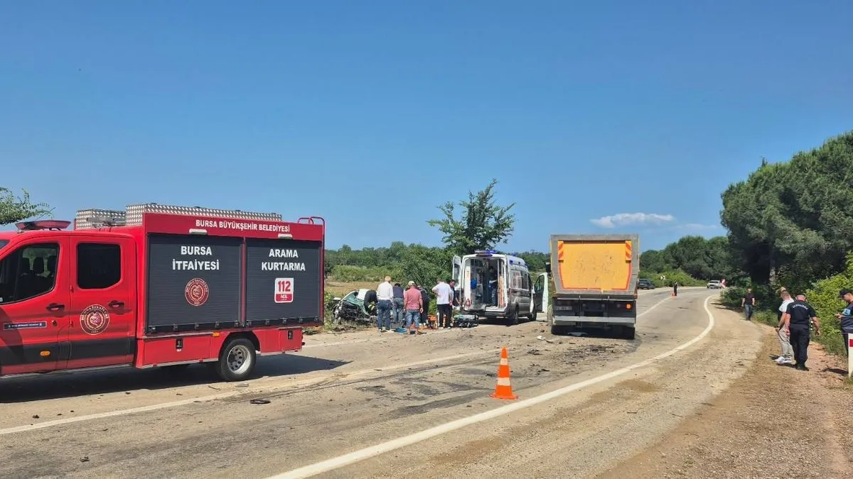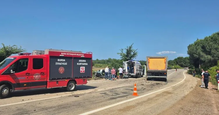 Karacabey-Bayramdere yolu üzerinde saat 15.20 sıralarında 16 HCY 12 plakalı kamyon sürücüsü A. K.(47) seyir halindeyken karşı yönden gelen16 BKP 968 plakalı otomobil ile kafa kafaya çarpıştı. 16 BKP 968 plakalı araç sürücüsü Batuhan Kaya (27) araç içerisinde sıkıştı. Kaya'yı itfaiye ekipleri sıkıştığı yerden çıkardı.