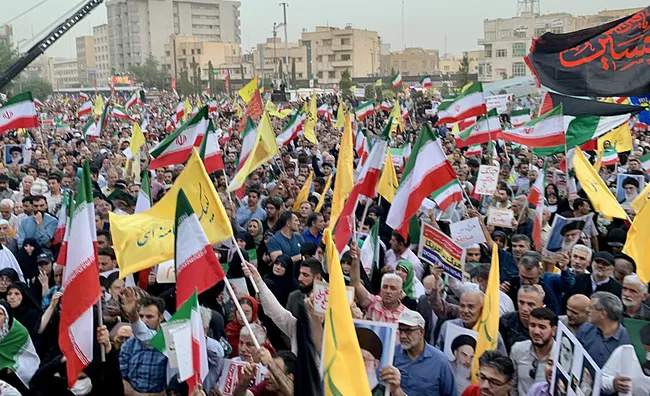 Göstericiler, "Cezalandırma devam ediyor", "İran kazandı", "Liderimizin arkasındayız", "Nükleer silah hakkımız" ve "Biz savaşmayı bilen bir milletiz" sloganları attı. İran Silahlı Kuvvetleri ve Devrim Muhafızları’na destek mesajlarının öne çıktığı gösteride, "Kahrolsun İsrail", "Kahrolsun ABD", "Siyonist rejim yok olacak", "Liderime canım feda" ve "Taviz yok" yazılı pankartlar taşındı.