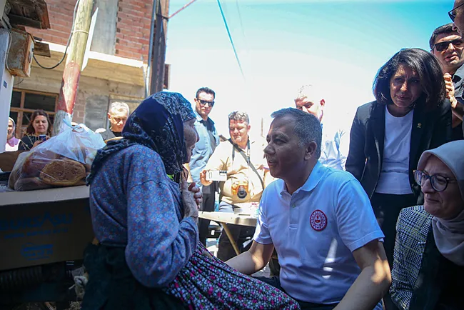 İçişleri Bakanı Ali Yerlikaya, Balıkesir'in Sındırgı ilçesinde meydana gelen 6,1 büyüklüğündeki depremde hasar gören kırsal Alacaatlı Mahallesi'ni ziyaret ederek, zarar gören evlerde incelemelerde bulunup mahalle meydanında vatandaşlarla sohbet etti.