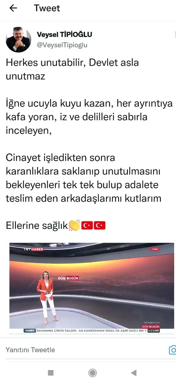Olayla ilgili sabah saatlerinde Kocaeli Adliyesine sevk edilen zanlı tutuklanırken, olayı çözen ekip ile ilgili Kocaeli İl Emniyet Müdürü Veysal Tipioğlu sosyal medya hesabından bir kutlama mesajı yayınladı. Tipioğlu , o mesajda şu ifadeleri kullandı. "Herkes unutabilir. Devlet unutmaz. İğne ucuyla kuyu kazan her ayrıntıya kafa yoran iz ve delilleri sabırla inceleyen, cinayet işledikten sonra karanlıklara saklanıp unutulmasını bekleyenleri tek tek bulup adalete teslim eden arkadaşlarımı kutlarım. Ellerine sağlık"