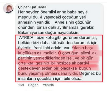 Alınan bilgiye göre, İl Emniyet Müdürlüğü Güvenlik Şube Müdürlüğü ekipleri, 22 Nisan'da Kanarya Mahallesi'nde 5 yaşındaki kız çocuğunun cinsel istismara uğraması sonrası sosyal medya hesabından, "4 yaşındaki çocuğun yeri annesinin yanıdır. Bakamıyorsan doğurmayacaksın. Ayrıca bize kötü gibi görünen durumlar belki de bizi daha kötüsünden korumak için öyledir. Yani ilahi adalet var. Yılanın başı küçükken ezilmelidir. O çocuğun ailesi AK Parti'nin yemlediklerinden ise ve bir gün ortalıkta gezinip bilinçsizce AK Parti'yi destekleyenlerden biri olacaksa bugün bunu yaşamış olması daha iyidir. Değmez bu insanların çocukları için bile olsa..." paylaşımını yapan kadının İzmir'de yaşadığını tespit etti.