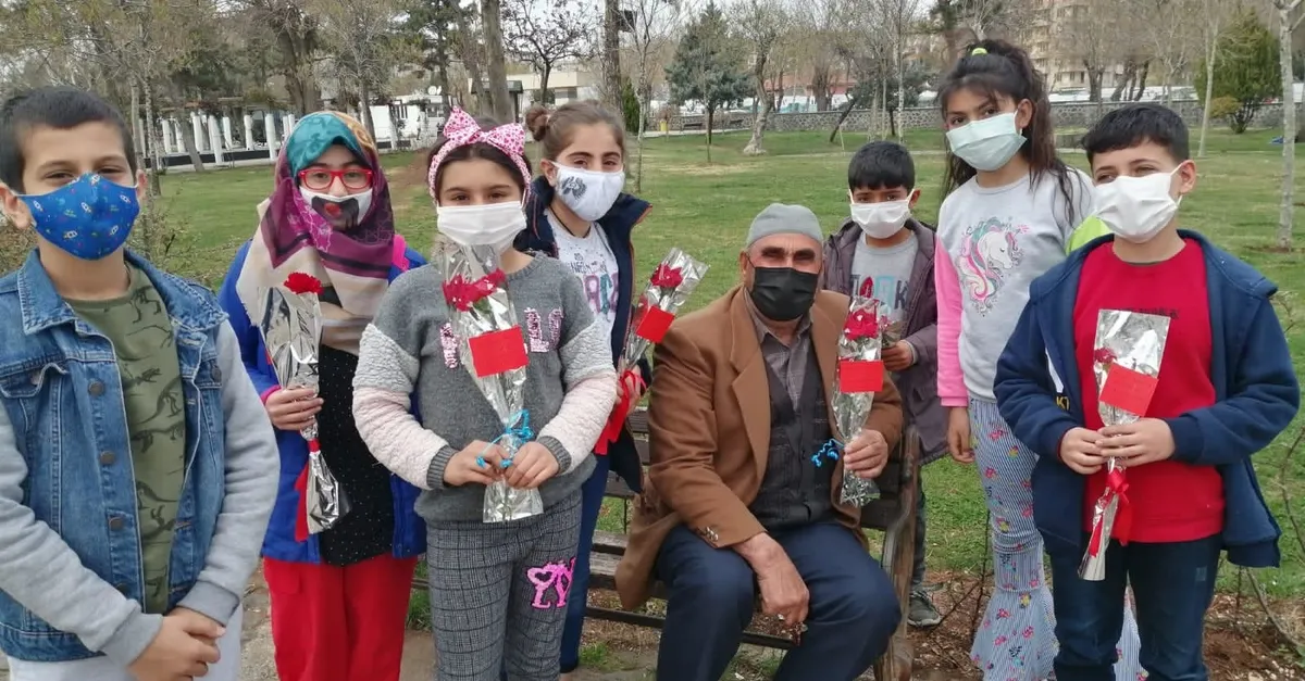 Öğrenciler, Sümerpark Ortak Yaşam Alanı'nda yürüyüşe çıkan ve banklarda oturan yaşlılara karanfil vererek sağlık ve huzur diledi.