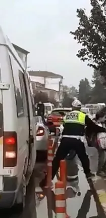 Polis memuru öğrencileri tek tek servisten elleriyle indirdi. Öğrencilerin ıslanmadan, güvenli bir şekilde okula geçmesini sağlayan polisin davranışı vatandaşların takdirini topladı.