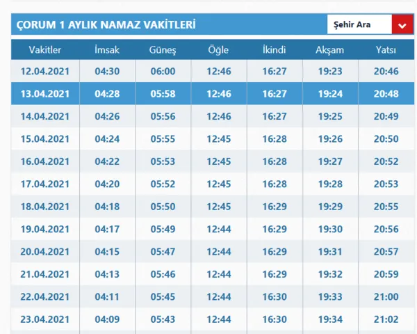 ÇORUM İMSAKİYE İLE İFTAR VAKTİ VE SAHUR SAATLERİ 2021