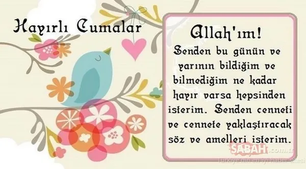 Allah'ım! Bana kendi sevgisini ve senin yanında sevgisi bana fayda verecek kimsenin sevgisini ver. Cumanız mübarek olsun.
