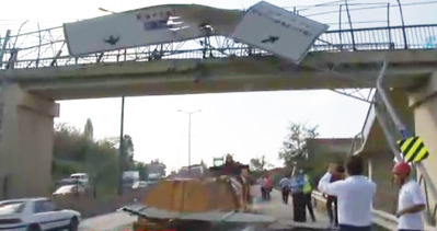 Edinilen bilgilere göre kaza, Kartal Soğanlık Yeni Gümüşpınar kavşağında meydana geldi. Kartal istikametine seyreden 34 FL 9317 plakalı kamyon sürücüsü Sezgin Serter, damperinin açıldığını fark etmedi. Bir süre damperi açık giden kamyon, yaya üst geçidine büyük bir gürültü ile çarptı. Çarpmanın etkisi ile damper koparak yola düşerken, kamyon ise bir evin bahçesine girerek durabildi.