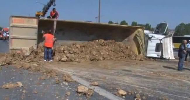 TEM Otoyolu'ndan Ankara istikametine seyir halinde bulunan Selahattin Yalçın'ın (51) yönetimindeki 34 LOD 86 plakalı hafriyat kamyonu, sürücüsünün direksiyon hakimiyetini kaybetmesi sonucu devrildi.