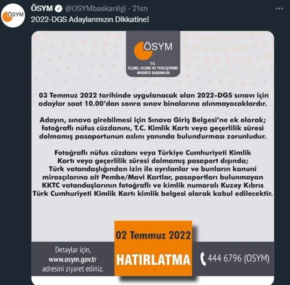 "03 Temmuz 2022 tarihinde uygulanacak olan 2022-DGS sınavı için adaylar, (Kıbrıs/Lefkoşa) dahil saat 10.00'dan sonra sınav binalarına alınmayacaklardır."
