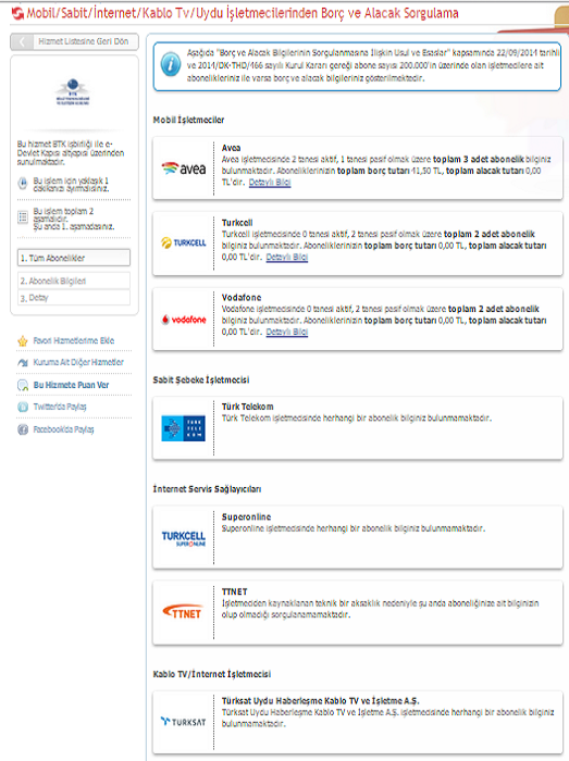 Bilgi Teknolojileri ve İletişim Kurumu tarafından e-Devlet Kapısı üzerinde sunulan Mobil / Sabit / İnternet / Kablo Tv / Uydu İşletmecilerinden Borç ve Alacak Sorgulama Hizmeti ile Türkiye içinde faaliyet gösteren büyük çaplı iletişim firmalarında isminize açılmış abonelikleri, bu aboneliklere ait hat numaralarını, varsa borç ve alacaklarınızı artık tek sayfa üzerinde görebilirsiniz.