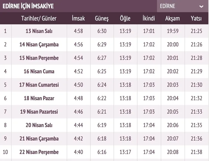 Ramazan ayı bu yıl 13 Nisan Salı günü başlıyor. On bir ayın sultanı yine aynı coşku ve sevinç ile karşılanırken, il il imsakiye de yayınlandı. Diyanet İşleri Başkanlığı'nın resmi internet sitesinden yayınlanan Ramazan İmsakiyesi ile Edirne'de iftar vakti ve sahur saatleri belli oldu. Edirne'de sahur vakti ve iftar vakti saat kaçta sorusu cevabını bulmuş oldu. 2021 Edirne Ramazan İmsakiyesi ile Edirne iftar saati, sahur vakti ve imsak vakti bilgileri sabah.com.tr'nin imsakiye sayfası üzerinden öğrenebilirsiniz.