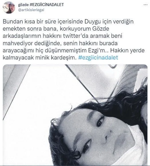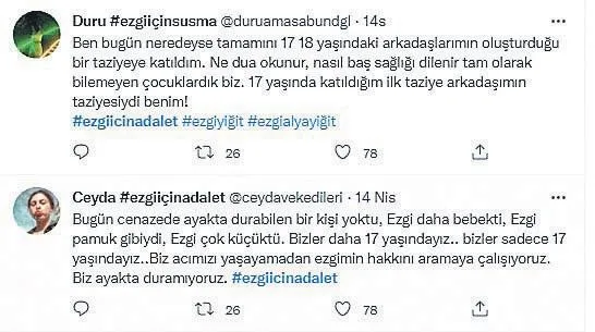Ezgi'nin ailesini yalnız bırakmayan okul arkadaşları sosyal medyada "ezgicinadalet" etiketiyle başlattıkları kampanya ile arkadaşlarının ölümüne neden olan Osman S.'nin gerekli cezayı almasını istedi: