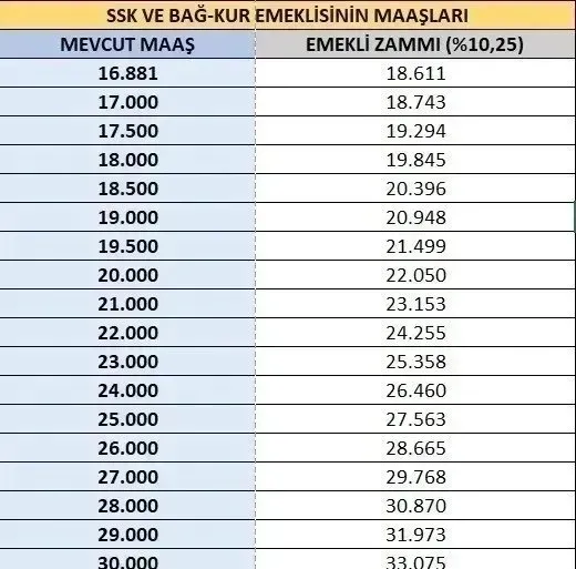 Eylül ayında emekliler yüzde 7.50 zammı cebe koymuştu. Eylül ayında enflasyonun yüzde 2.55 olarak gerçekleşmesiyle 4 aylık enflasyon yüzde 10.25'e yükseldi. Böylelikle SGK ve BAĞ-KUR emeklileri şimdiden 10.25'lik zam almayı garantiledi. Yeni zam oranına göre 16 bin 881 TL olan en düşük SGK ve BAĞ-KUR emeklisi maaşı 18 bin 611 TL'ye yükselecek. Bu rakam Kasım ve Aralık ayı rakamlarıyla daha da yükselecek.