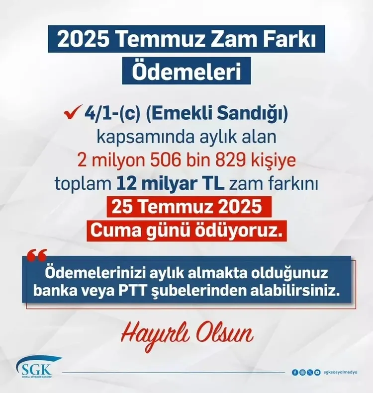 Diğer taraftan SGK'dan 4C Emekli Sandığı zam farkı için ödeme tarihi açıklandı. Buna göre Emekli Sandığı kapsamında aylık alan 2 milyon 506 bin 829 kişiye toplam 12 milyar TL zam farkının 25 Temmuz 2025 Cuma günü hesaplara geçeceği belirtildi.