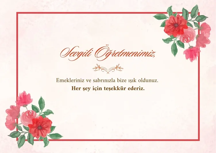"Sevgili Öğretmenim, yıllar geçse de o şefkatli gülümsemeniz, bizlere olan inancınız ve verdiğiniz dersler aklımızdan hiç silinmeyecek. Bizi hayata hazırlayan, yanlışlarımızı sabırla düzelten, her birimize ayrı ayrı değer veren değerli öğretmenimizi bu özel günde saygı ve sevgiyle anıyoruz. Öğretmenler Gününüz en içten dileklerimizle kutlu olsun."