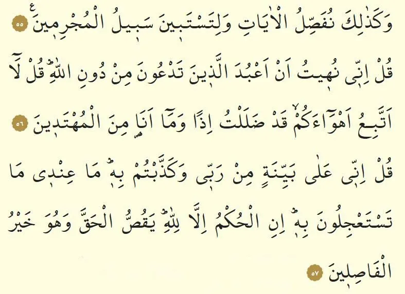 56. Ayet: Kul innı nühıtü en a'büdellezıne ted'une min dunillah kul la ettebiu ehvaeküm kad daleltü izev ve ma ene minel mühtedın