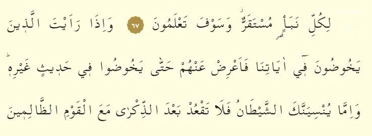 68.Âyetlerimiz hakkında dedikoduya dalanları gördüğün vakit başka bir söze dalıncaya kadar onlardan yüz çevir, uzaklaş. Şayet şeytan sana unutturursa hatırladıktan sonra (kalk), o zalimler grubu ile beraber oturma.