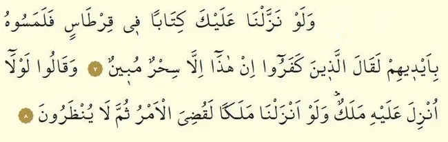 7. Ayet anlamı: Şayet sana kâğıt üzerine yazılmış bir kitap indirseydik ve onlar elleriyle onu tutmuş olsalardı, yine de o inkârcılar, "Bu apaçık bir büyü, başka bir şey değil" derlerdi.
