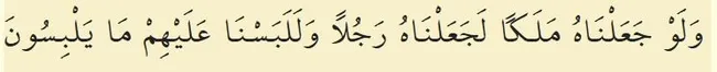 9. Ayet anlamı: Şayet peygamberi bir melek kılsaydık muhakkak ki onu (yine) bir adam suretine sokar, onları yine halen içinde bulundukları kuşkuya düşürürdük.