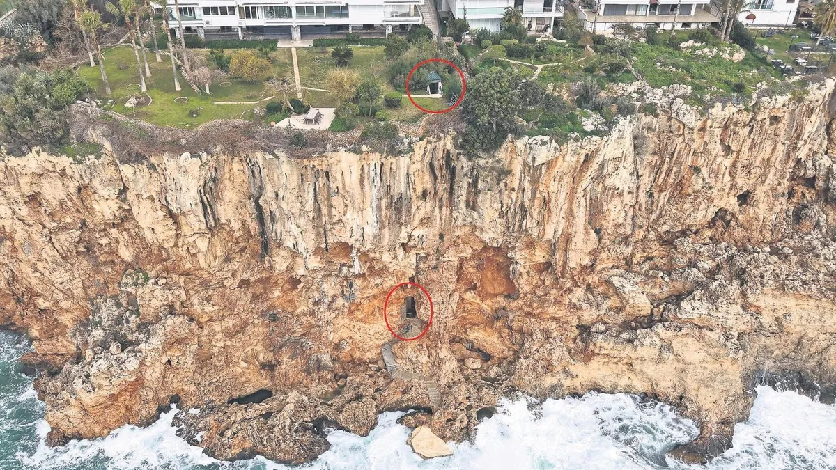 Antalya Konyaaltı Beach Park'tan başlayıp, Lara kıyılarına doğru denize sıfır ve yüksekliği 40 metreyi bulan, 'Tufa Kıyı Falezi' özelliği ile dünyada tek olan falezlerde hobi amaçlı dalış yapan Hüseyin Fırat, Konyaaltı Caddesi bölgesindeki falezlerin bulunduğu kısımda yaptığı dalışta, kayalıklar arasında baraka ve denize inilen demirden merdiveni fark etti. Merdivenden yukarı çıkan Fırat, falezlerin üzerinde kaçak betonarme bir yapı ile karşılaştı. Fırat, beton duvarlar ve demir kapı bulunan kaçak barakanın demir kapısındaki delikten görüntü aldığında; içeride kano, sandalyeler, duş ve av malzemeleri bulunan bir oda ve kara ile bağlantılı olduğu düşünülen merdivenleri görüntüledi.