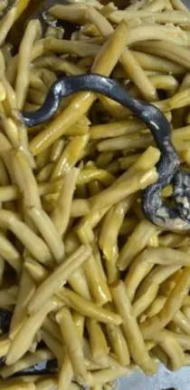 Fasulye konservesi kutusunu açıp pişirmek üzere ocaktaki tavaya döken kadın, fasulyenin üzerinde siyah yabancı bir cisim görünce kocasına haber verdi.