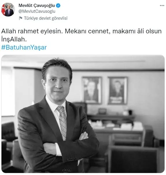 Dışişleri Bakanı Mevlüt Çavuşoğlu'ndan da hayatını kaybeden Yaşar'la ilgili bir paylaşım geldi. Çavuşoğlu "Allah rahmet eylesin. Mekanı cennet olsun. makamı ali olsun İnşallah" ifadelerini kullandı.