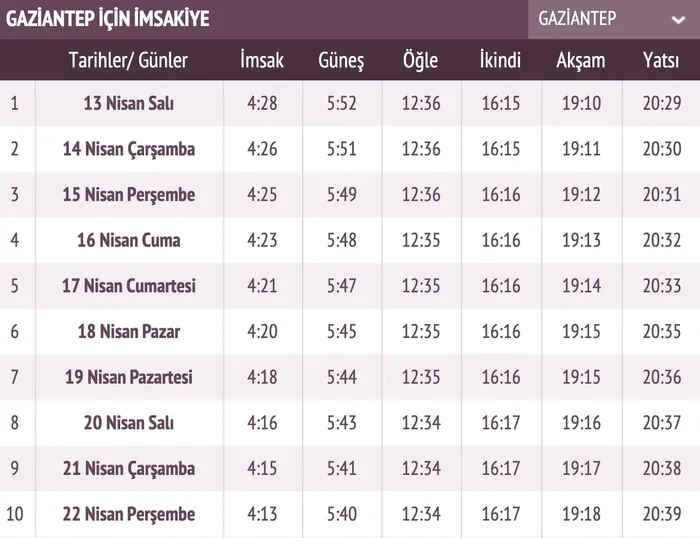 Gaziantep Ramazan imsakiyesi ile iftar vakti ve sahur saatleri bilgilerini öğrenebilirsiniz. Diyanet'ten yayınlanan verileri göre Gaziantep iftar saati ve sahur vakti şöyle;