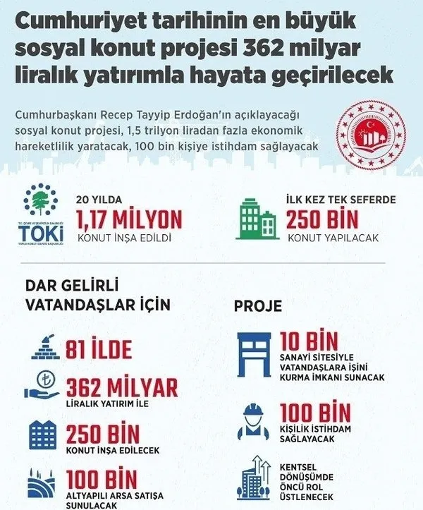 Böylece sosyal konut sayımızı 2 milyona çıkarmış olacağız. Projemizin ve bu kapsamda yapılacak konutlar ile iş yerlerinin isimlerini "İlk Evim ve "İlk İş yerim" olarak belirledik.