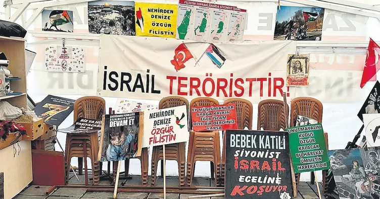 İsrail'in Gazze'de yürüttüğü soykırımın boyutlarını gösteren fotoğrafların da sergilendiği eylemde vatandaşların da katılımıyla oturma nöbeti devam ediyor. Ailelerin de katıldığı nöbet boyunca, vatandaşlara broşürler dağıtılarak boykota katılım çağrısı yapılıyor.