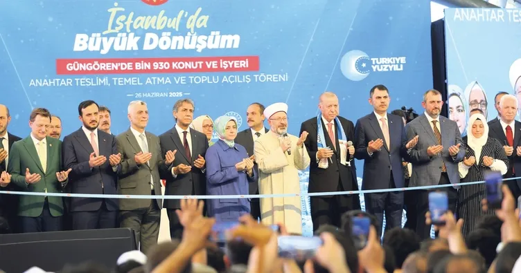 Cumhurbaşkanı Erdoğan, Merter Etkinlik Alanı'nda gerçekleştirilen törende, "Güngören'de yapılan kentsel dönüşüm çalışmalarında 768 konut 30 işyeri olmak üzere toplam 798 bağımsız bölümün anahtarlarını hak sahiplerine teslim ettik. 2027'de tamamlanmasını öngördüğümüz bin 77 konut 55 işyeri olmak üzere bin 132 bağımsız bölümden oluşan Tozkoparan 4. Etap 1. ve 4. kısım temellerini atacağız. İnşallah 2027 yaz aylarında bin 845 konut 85 iş yeri olmak üzere toplam bin 930 bağımsız bölümün teslimini yapmış olacağız. Deprem hazırlıklarımızı tamamlama fırsatı bulamadan her an kapımızı çalabilir. Kentsel dönüşüm bizim için bir tercih değil, adeta bir milli güvenlik meseledir. Planlarımızı bu tehlikeyi bertaraf etmek üzere hayata geçirmek mecburiyetindeyiz. 2012'den bugüne İstanbul'da 923 bin konut ve iş yerinin dönüşümünü tamamladık. Hali hazırda 208 bin 915 konut ve iş yerini dönüşümü devam ediyor. İstanbul'da 5 milyon 579 bin metrekare alanda 34 millet bahçesini hizmete açtık. Yarısı bizden kampanyasındaki destek tutarlarını güncelledik" dedi.