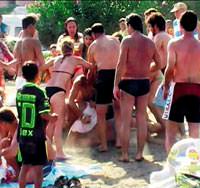 Plajda bulunanların çabalarına rağmen önlenemeyen kavga kısa sürede büyüdü. Zabıtanın müdahale ettiği kavga durdurulamayınca polis çağırıldı. Kadınlar kendilerini görüntüleyen gazetecilere de saldırdı. Gazetecilerin kameralarını almaya çalışan kadınlar bunda başarılı olamayınca üzerlerine kum atarak çekim yapılmasına engel olmak istedi. Kavga sırasında sinir krizleri geçirerek yere düşen Yurdagül Aşıkoğlu, zabıta ekiplerine, "Ben Başbakanlık Müsteşarlığı'nda çalıştım. Bizimle neden ilgilenilmiyor, bize saldırdılar, bunlardan şikâyetçiyim" dedi. Aşıkoğlu,Marmaris Devlet Hastanesi Acil Servisi'ne kaldırıldı. Ayakta tedavi edilen kadın karakola giderek şikâyetçi oldu.