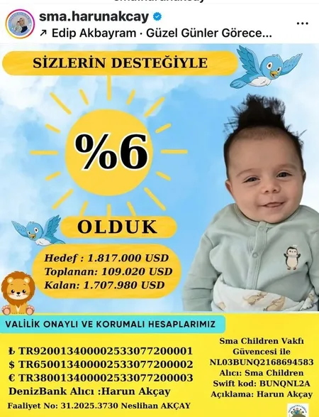 Hataylı Neslihan-Mustafa Akçay çiftinin dünyaya gelen ikinci çocukları Harun'un topuk kanından alınan örnekte SMA Tip -1 hastası olduğu tespit edildi. Aile Harun'un tedavisi için gerekli olan paranın toplanması için Valilik onaylı kampanya başlattı. Anne Neslihan Akçay (33), "Oğlumun yaşamasını istiyorum. Tedavi olması için maddi gücümüz yeterli değil. Kampanyaya herkesin desteğini bekliyoruz. Harun'umun gülüşü yarım kalmasın" dedi.