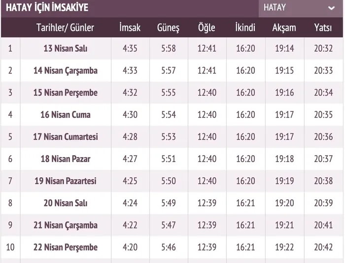 Ramazan ayı bu yıl 13 Nisan Salı günü başlıyor. On bir ayın sultanı yine aynı coşku ve sevinç ile karşılanırken, il il imsakiye de yayınlandı. Diyanet İşleri Başkanlığı'nın resmi internet sitesinden yayınlanan Ramazan İmsakiyesi ile Hatay'da iftar vakti ve sahur saatleri belli oldu. Hatay'da sahur vakti ve iftar vakti saat kaçta sorusu cevabını bulmuş oldu. 2021 Hatay Ramazan İmsakiyesi ile Hatay iftar saati, sahur vakti ve imsak vakti bilgileri sabah.com.tr'nin imsakiye sayfası üzerinden öğrenebilirsiniz.
