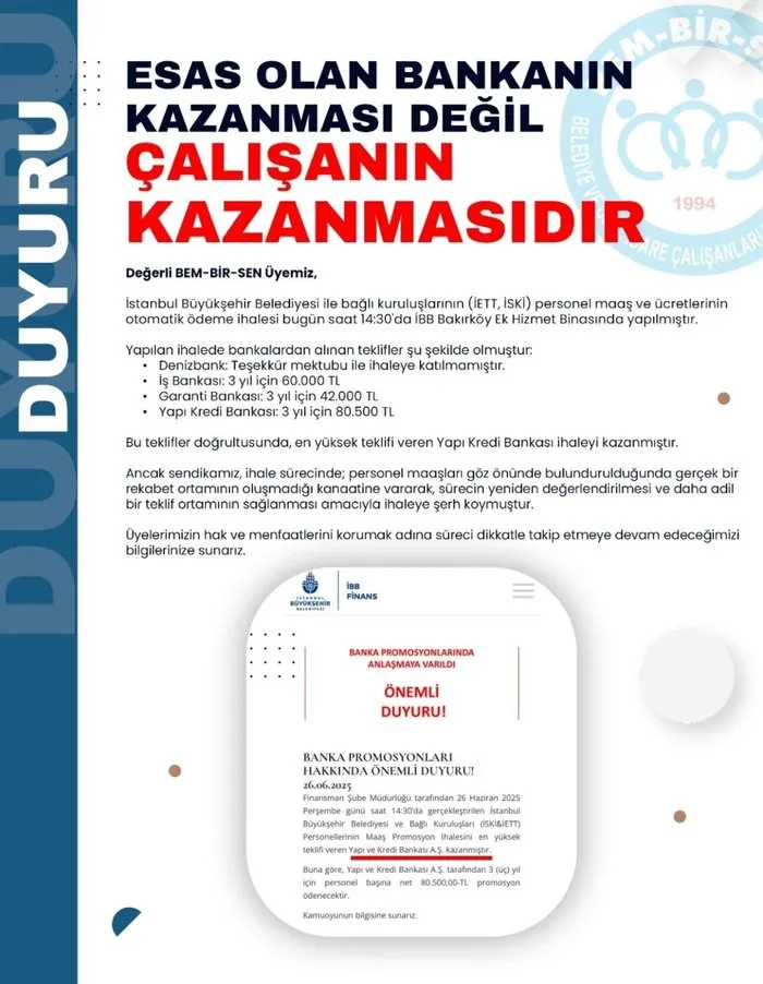 Anlaşmaya göre, banka tarafından personel başına üç yıllık süre için net 80 bin 500 TL ödeme yapılacak. Tüm İBB çalışanlarını kapsayacak anlaşma için İBB tarafından şu açıklama yapıldı: "Finansman Şube Müdürlüğü tarafından 26 Haziran 2025 Perşembe günü saat 14.30'da gerçekleştirilen İstanbul Büyükşehir Belediyesi ve Bağlı Kuruluşları olan İSKİ ve İETT Personellerinin Maaş Promosyon İhalesini en yüksek teklifi veren Yapı ve Kredi Bankası A.Ş. kazanmıştır. Buna göre, Yapı ve Kredi Bankası A.Ş. tarafından üç yıl için personel başına net 80.500 TL promosyon ödenecektir. Kamuoyunun bilgisine sunarız." Bu anlaşma ile birlikte Tüm İBB çalışanları, maaş ödemelerinde belirlenen banka üzerinden promosyon ödemesi alacak.
