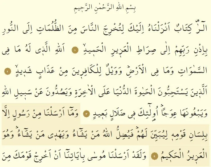 4. Ayet: Vemâ erselnâ min rasûlin illâ bilisâni kavmihi liyubeyyine lehum(s) feyudillu(A)llâhu men yeşâu veyehdî men yeşâ(u)(c) vehuve-l'azîzu-lhakîm(u)
