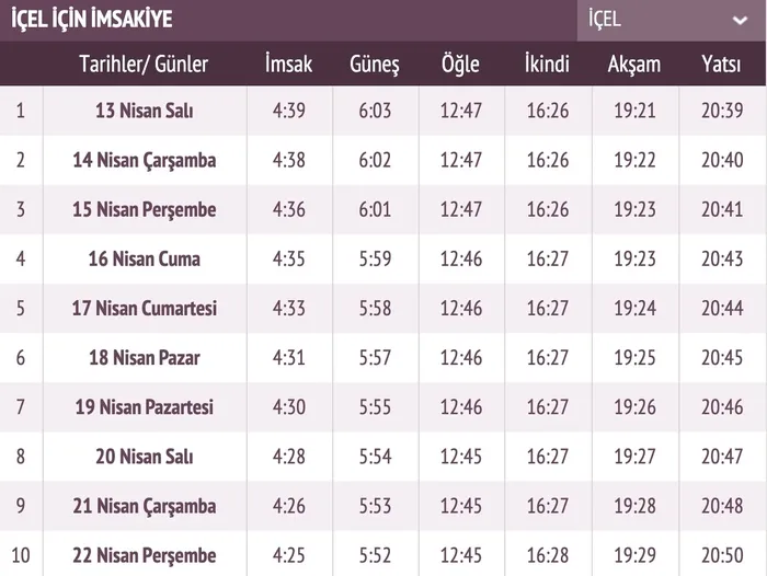 İçel Ramazan imsakiyesi ile iftar vakti ve sahur saatleri bilgilerini öğrenebilirsiniz. Diyanet'ten yayınlanan verileri göre İçel iftar saati ve sahur vakti şöyle;