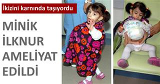 İlknur bebeğin doğumuyla ilgili konunun, tıpta ender görülen hastalıklardan olduğunu ve yaklaşık 50 bin doğumda bir görüldüğünü belirten Tuncer, ''Yaklaşık 10 saat süren başarılı bir operasyon ile İlknur İ'nin, başı olmayan karnındaki yapışık ikizi ayrıldı. İlknur, şuan yoğun bakımda tedavi altında. Ameliyattan sonra bağlandığı suni solunum cihazından ayrıldı, ancak hala yoğun bakımda tedavisi sürüyor. Şuan için her şey yolunda gibi görülüyor'' dedi.