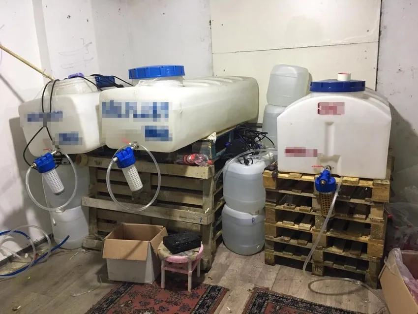 Aramalarda, 110 adet dolu rakı şişesi, 600 adet dolu viski şişesi, 11 adet içerisinde etil alkol bulunan 30 litrelik bidon, 24.000 adet TAPDK ibareli bandrol, 2 adet 500 litrelik vana ve arıtma cihazı takılı su tankeri, 1 adet 400 litrelik vana ve arıtma cihazı takılı su tankeri, 2 adet kirli su dalgıç pompası, 14 şişe 1 litrelik anason esansı ve çok sayıda sticker/etiket ele geçirildi.