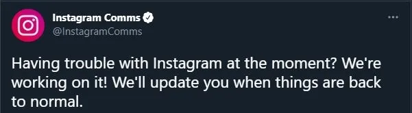 "Şu anda Instagram ile sorun mu yaşıyorsunuz? Üzerinde çalışıyoruz! Her şey normale döndüğünde sizi bilgilendireceğiz."