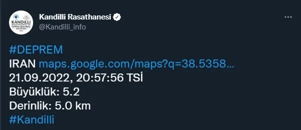 Boğaziçi Üniversitesi Kandilli Rasathanesi ve Afet ve Acil Durum Yönetimi Başkanlığı (AFAD)'ın sürekli olarak güncellediği ve kamuoyuna duyurdu son depremler listesine göre İran'da saat 20:57'de 4.9 şiddetinde bir son dakika depremi meydana geldi. Yerin 7.40 kilometre derinliğinde meydana gelen deprem merkez üssüne yakın illerimizde de hissedildi.