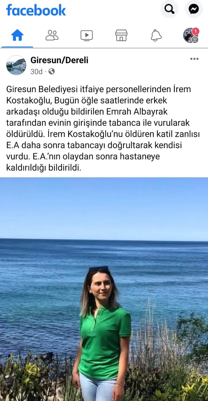 Giresun Belediyesi itfaiye personellerinden İrem Kostakoğlu, Bugün öğle saatlerinde erkek arkadaşı olduğu bildirilen Y.A tarafından evinin girişinde tabanca ile vurularak öldürüldü. İrem Kostakoğlu'nu öldüren katil zanlısı Y.A daha sonra tabancayı doğrultarak kendisi vurdu. Y.A.'nın olaydan sonra hastaneye kaldırıldığı bildirildi.