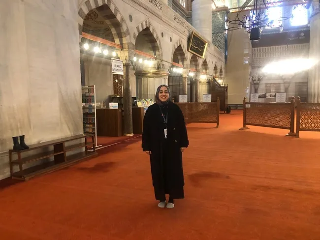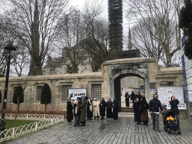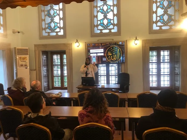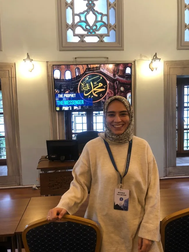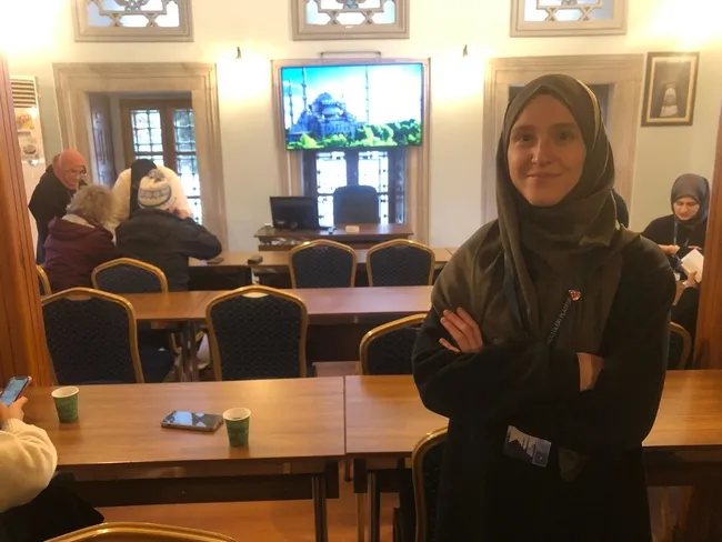 Sultanahmet Camii Koruma ve İhya Derneği'ne bağlı çalışan gönüllülerin koordinatörü Tuğçe Yılmaz (28) İslam Bilgilendirme Merkezi'nde bizi karşılıyor. O, Marmara Üniversitesi İngilizce İlahiyat Fakültesi mezunu ve İstanbul Gelişim Üniversitesi'nde Turizm Rehberliğinde yüksek lisans yaptığından söz ediyor. 2018 yılından beri gönüllü olarak İslam'ı anlatma hizmetini sürdürüyor. Yılmaz, 14 dilde tebliğ yapan gönüllülerin bilmedikleri dil ile karşılaştıklarında ise hemen o dili bilen biri ile irtibat kurup tebliği sürdürdüğünden söz ediyor. Ardından Sultanahmet Cami'sinin A kapısının olduğu bölümde hemen solda ise iki katlı küçük bir tarihi binada İslam'ı anlatan sunumların da yapıldığından bahsediyor. Tuğçe Yılmaz ile cami içinde koyu bir sohbete başlıyoruz.