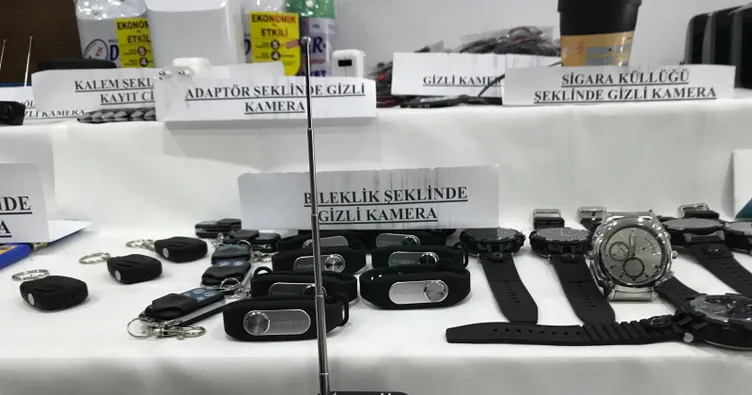 Şüphelilerin, piyasa değeri 400 bin lira olan ve 50 lira ile 800 lira arasında fiyatlara satışa sunulan gizli kamera içerikli ürünleri Çin'den getirdikleri iddia edildi. Cihazların 'Özel hayatın gizliliğini ihlal' suçu oluşturabileceği için mahkeme kararı dışında kullanılamayacağı belirtildi. İşte içerisinde gizli kamera bulunan ve operasyonda ele geçirilen malzemeler: Duman dedektörü, bileklik, gözlük, sigara küllüğü, oda spreyi, oyuncak, böcek arama cihazı, takip cihazı, kontak anahtarı, çakmak, ses kayıt cihazı, kalem, sinyal bozucu.
