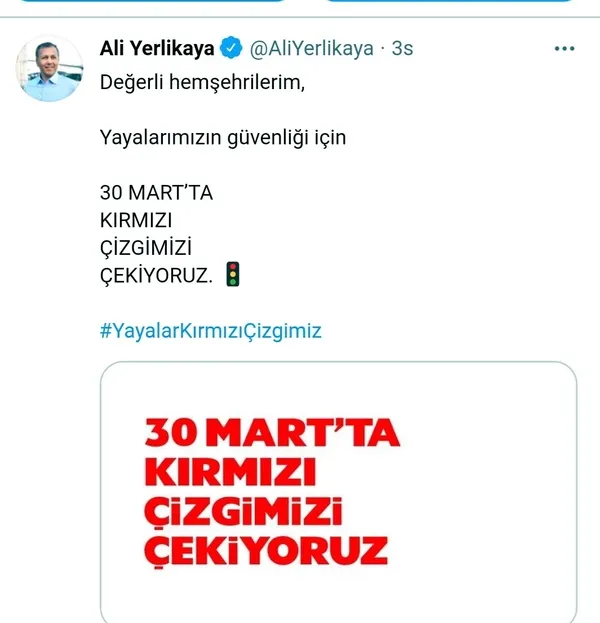 İstanbul Valisi Ali Yerlikaya Sosyal Medya hesabından yaptığı açıklamada 30 Martta Kırmızı Çizgimizi çekiyoruz" mesajı ile Kavşak giriş ve çıkışları ile yaya ve okul geçitlerine yaklaşırken yavaşlamak, varsa buralardan geçen veya geçmek üzere bulunan yayalara durarak ilk geçiş hakkını vermeye dikkat çekmek ve farkındalık oluşturmak amacıyla "30 MART'TA KIRMIZI ÇİZGİMİZİ ÇEKİYORUZ" uygulaması gerçekleştirilecektir.