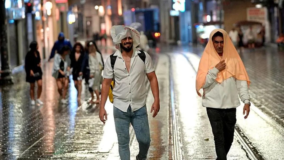 İstiklal Caddesi'nde yağışa hazırlıksız yakalanan vatandaşlar apartman girişlerine sığınırken, bazıları da şemsiyeleriyle yağıştan korunmaya çalıştı.
