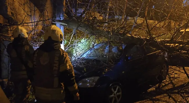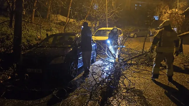 Beykoz'da etkili olan fırtına nedeniyle devrilen ağaç, park halindeki 2 otomobilin üzerine düştü. Olayda yaralanan olmazken, araçlarda hasar meydana geldi.